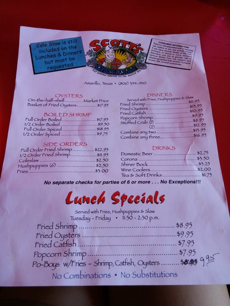 Welcome to Scott's Oyster Bar, a charming Cajun and Creole seafood haven nestled in Amarillo, Texas. This lively eatery is famed for its vibrant atmosphere and delightful menu, making it a top choice for both locals and visitors. The highlights include a Basket of Fried Oysters for $19.95 and a satisfying 1/2 Order of Spiced Boiled Shrimp for just $10.25. Each dish speaks to the quality and freshness that guests rave about, as evidenced by glowing reviews from satisfied patrons like Kathy B. and Todd S.